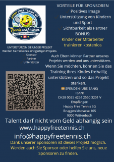 Die Teilnahme am Training erfolgt auf eigene Verantwortung. Für Unfälle, Verletzungen oder Schäden übernimmt Happy Free Tennis SG keine Haftung. Es wird empfohlen, dass alle Teilnehmer über eine ausreichende Unfallversicherung verfügen.