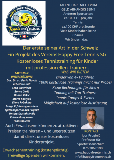Unser Projekt bietet Kindern und Jugendlichen in St. Gallen kostenloses Tennistraining. Ziel ist es, sportliches Talent unabhängig von finanziellen Möglichkeiten zu fördern und allen Kindern faire Chancen im Sport zu geben. Der Verein Happy Free Tennis SG arbeitet standortunabhängig und kooperiert mit verschiedenen Tennisclubs in der Region
