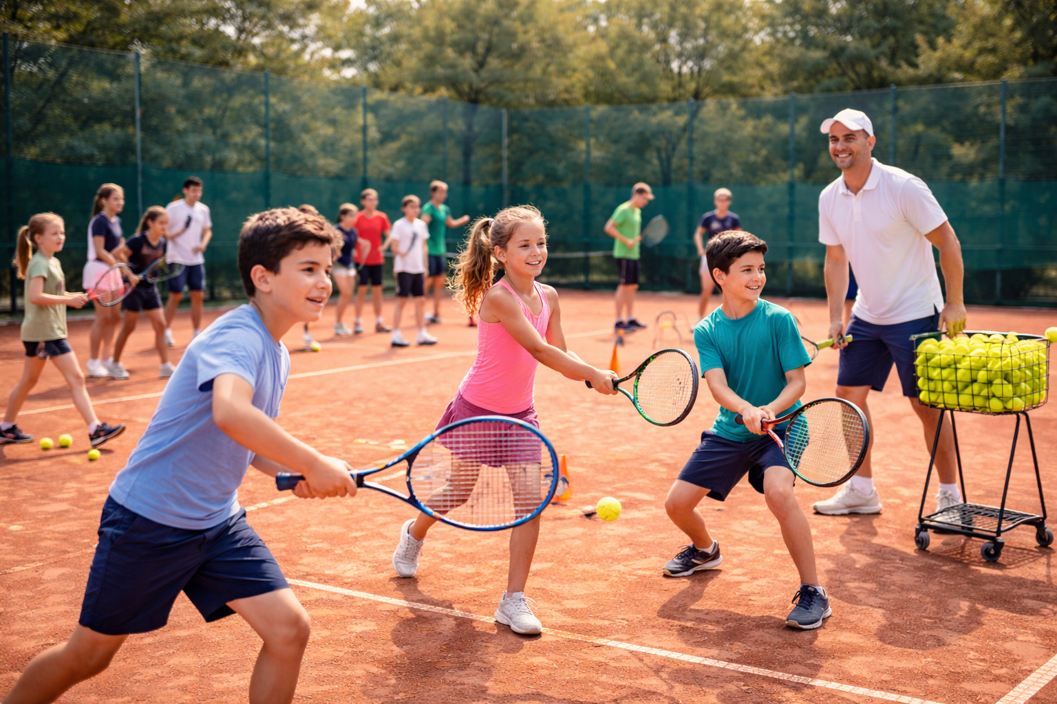 Professionelles Tennistraining für Kinder und Jugendliche von 4 bis 18 Jahren. Spielerisch lernen die Kinder Technik, Bewegung und Freude am Tennis – vollständig kostenlos.