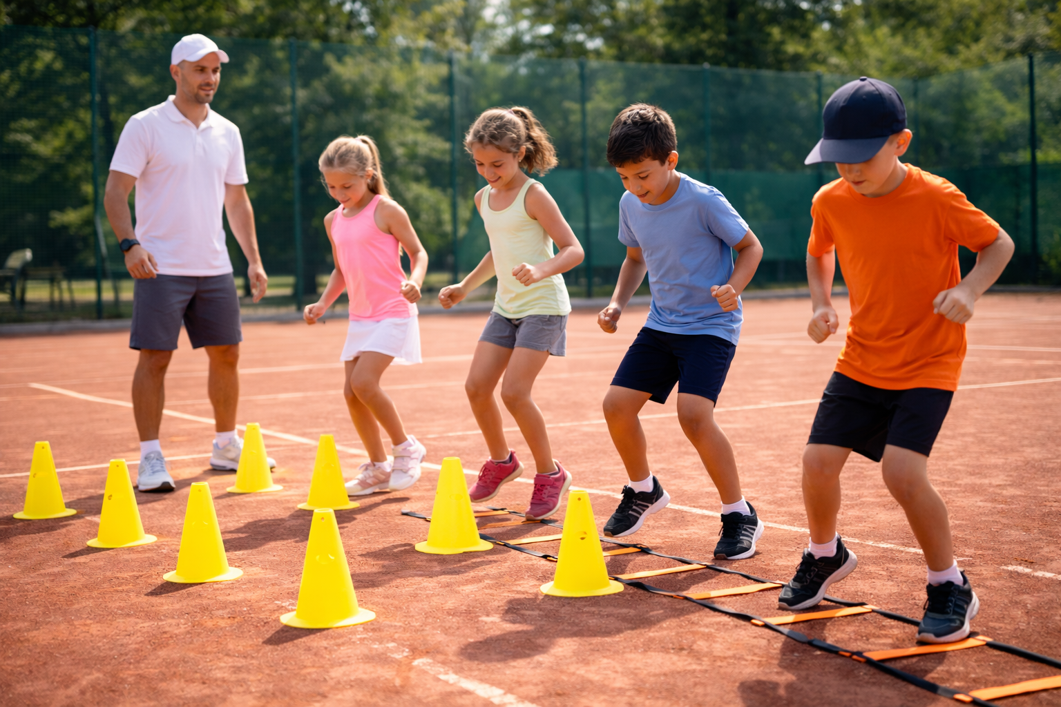 Athletik- und Koordinationstraining speziell für junge Tennisspieler. Übungen mit Leiter, Hütchen und Bewegungsspielen verbessern Schnelligkeit, Balance und Beweglichkeit.